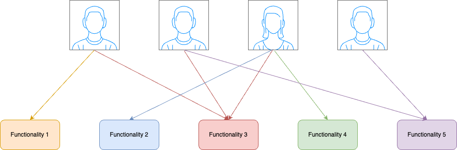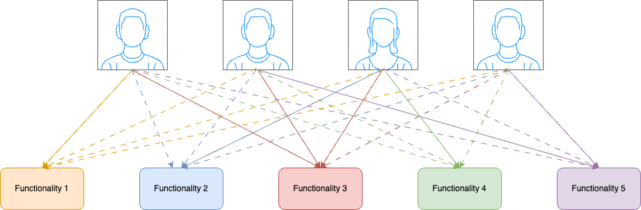 Throughout the application's life, each person works on separate functionalities. Sometimes together, other times alone. Things seem to be going okay.